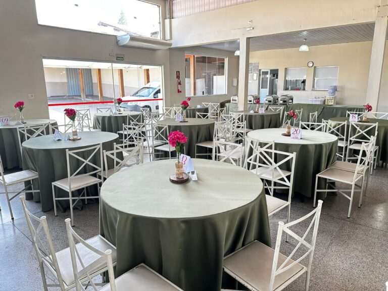 Temos também mesas, cadeiras, toalhas, pratos, taças, talheres e rechaud, e você pode usufruir desse espaço por um preço bem competitivo.